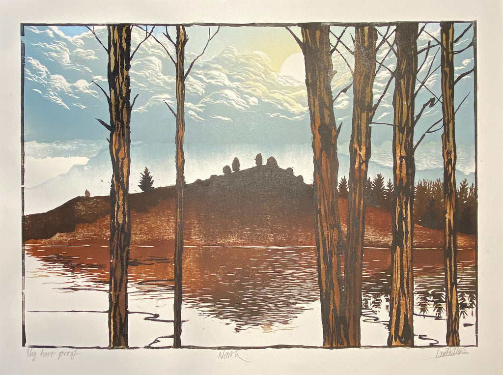 Early days on this one. Concentrating on the relative tones of the different blocks for the clouds and sun. Foreground trees and mid ground hills printed to give a framework for sky.